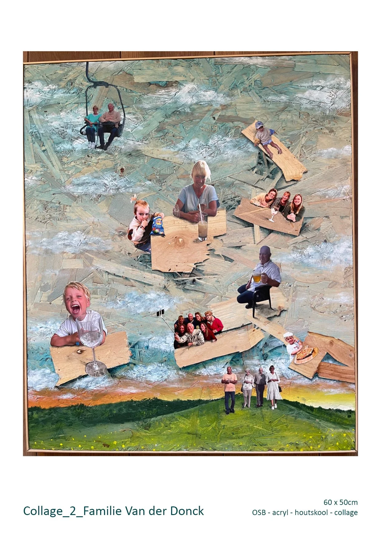 Daarnaast verzamel ik informatie over favoriete of gewenste kleuren, evenals specifieke herinneringen en eigenschappen van de personen die in het werk verwerkt worden. Dit helpt mij om extra, passende beeldelementen te integreren, zowel geschilderd en geïllustreerd als in collagevorm.